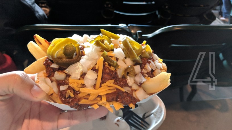 Is everything with potatoes suddenly Irish? If it was actually Irish I figure it should be a baked potato rather than steak fries. Anyway, the bigger point is that these aren’t nachos. They’re chili cheese fries. My expectation of ballpark nachos is that they have cheese sauce, not shredded cheese. Beyond that, they should have taco meat and/or beans, but definitely not chili. The jalapenos get you a little bit of credit, but not much. You have to at least melt the cheese to come anywhere close to a technical nacho variant.