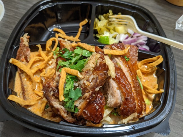 The Strip was interesting. It was crowded, but it was the least crowded I’ve ever seen it. The rate of mask-wearing outside was somewhere around 50%, but the rate of mask-wearing indoors was close to 100%. The casinos seem to be doing a good job of enforcing their mask mandates, so had we taken advantage of some of the discounted rates on the strip we likely would have been fine. On the other hand, our hotel was a 5 minute walk from Lotus of Siam, one of my favorite restaurants in Vegas. I ordered some fancy curry duck thing. It was great. The past times I’ve been to Lotus of Siam I’ve had other people order for the table and we shared dishes. I enjoyed everything, but when I was on my own I didn’t know what to focus in on. In hindsight I might have been happier with someone closer to a traditional noodle dish, but I was still pretty happy.