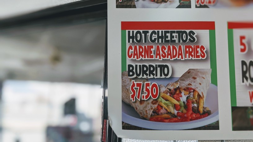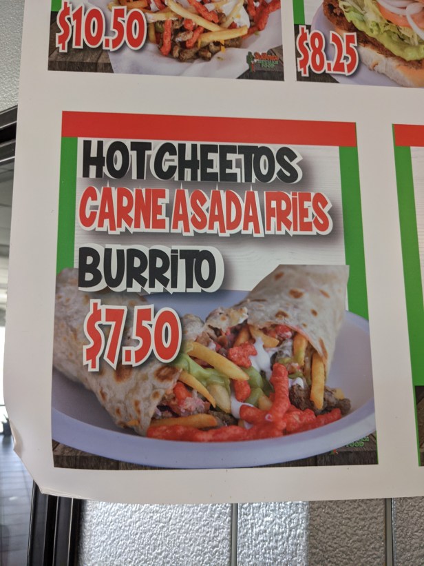 Alright, so Hot Cheetos, but also carne asada? Sure, why not? Who doesn’t like carne asada, and why shouldn’t you dump a bunch of Hot Cheetos into that burrito? But wait…it’s not just carne asada, it’s carne asada fries, which is it’s own food category. They’re seriously wrapping a plate of carne asada fries into a flour tortilla, but mixing in a bunch of Hot Cheetos to keep it interesting. The novelty of all this was more than I could resist and I committed to my lunch.