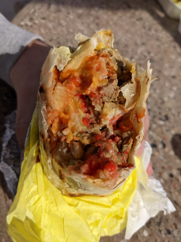 To the surprise of no one, this was awesome. Hot Cheetos were not a contradictory flavor profile to a carne asada burrito, and throwing french fries into a burrito is nothing new for anyone that’s been to Southern California. This wasn’t a gourmet meal by any means, but it was a starchy, spicy, and savory hand-held lunch vessel that got the job done. I thought that the carne asada could have been much better. I also thought the french fries could have been fresher and crispier, but when combined with a bit of fresh salsa I was very satisfied with my meal. The Hot Cheetos stained whatever they touched inside the burrito, but they didn’t overwhelm it. If anything, it could have used a bit more guacamole or substance from other ingredients, but it was cheesy, and savory, and a little spicy. Good stuff.