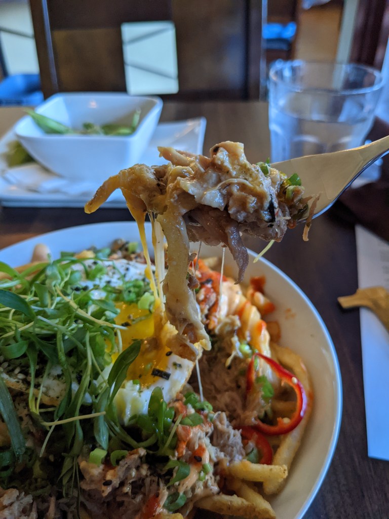 At first glance they seemed pretty similar to the Spicy Beef Bulgogi Fries that I tried back in January. I freaking loved those fries. They have the same salt and pepper seasoned shoestring fries, smoked gouda (a perfect cheese choice), but instead of marinated flank steak it’s loaded with the best kalua pork I’ve ever had in my life, a runny egg, sriracha mayo, and sriracha. Oh yeah, and a healthy dose of scallions. With the amount of other rich ingredients on the plate it was nice having something fresh to cut through.
