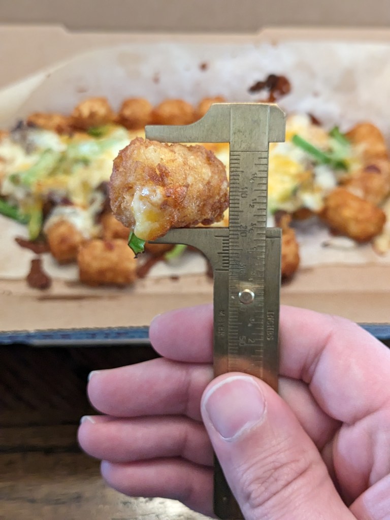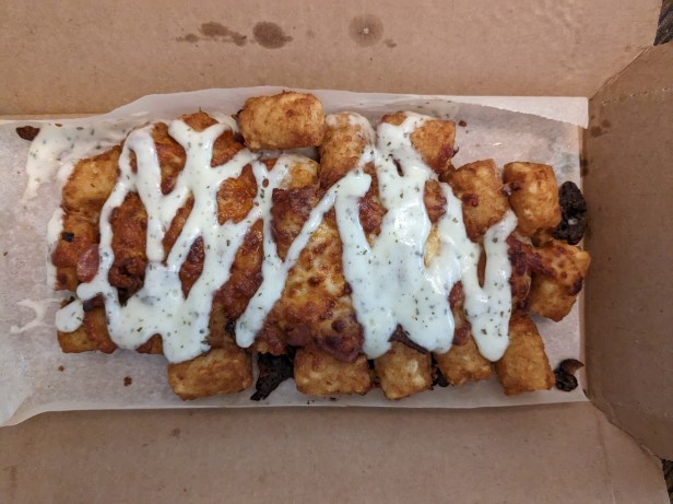 There were a few naked tots around the perimeter, and they were crispy and hot. The convection pizza oven did a nice job of approximating a fried texture (I’m sure they were par fried and then shipped to the store), and even after the 10 minutes in the box/car they were a reasonable temperature to consume. The cheese blend on top was beautifully browned. I also thought that the stripes of garlic parmesan sauce added a lot of visual appeal to the dish.