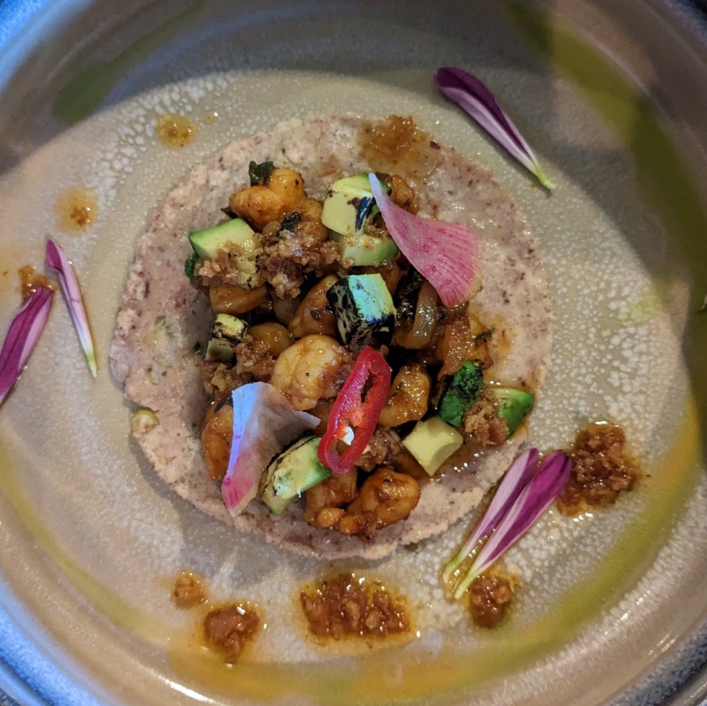 Taco 4 – Chicken Karaage. This taco took us back to a Japanese frying technique and was a total textural contrast to the birria taco before it. The chicken was juicy, but perfectly crisp and light. The spicy miso sauce was bright and clean, and the fresh yellow corn tortilla had a lot of roasted corn flavor. Probably one of my favorites of the night, and that’s saying something. The sorrel added a lot of color to the presentation as well.