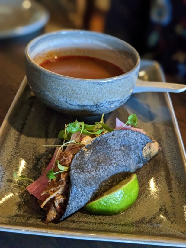 Taco 3 – Quesabirria. Slow braised beef birria with queso oaxaca, an activated charcoal nixtamalized tortilla, micro cilantro, pickled red onion, consomé, and lime. These were more familiar flavors (I love quesabirria tacos), but very well executed. The beef was tender enough that a man of my age could eat it without any fear of tooth failure. The dipping broth (consomé) enhances the taco because it’s the same liquid that the beef was braised in. It’s an onion and chile bomb that lingers with you like long covid. Yikes…what a terrible analogy. It’s good. It’s really good. The fresh tortilla elevated this taco above what you’ll find in the local trucks. After finishing the taco I made sure to eat most of the broth as well. Too good to waste.
