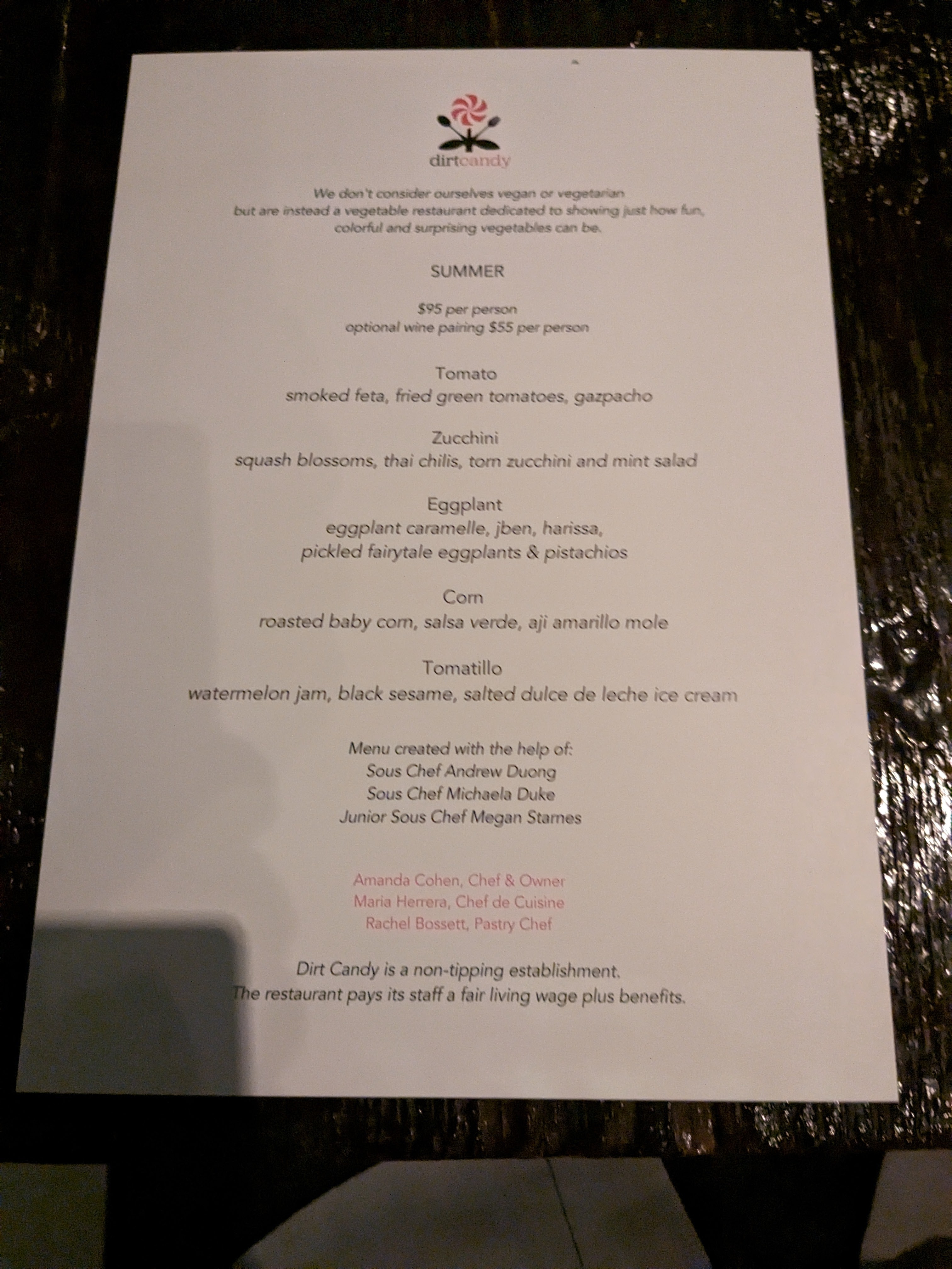 So, why Dirt Candy? I was looking for a unique tasting menu. Dirt Candy kept popping up in various articles and lists, and the reviews were top notch. They serve a seasonal 5 course vegetarian tasting menu with a few surprises between the named plates. While I’m not vegetarian, I do appreciate the creativity required to design vegetable focused dishes at this level of a service. $95 per person isn’t something that I can swing everyday (or week, or month), it did include gratuity and looked to be a good value for the money.