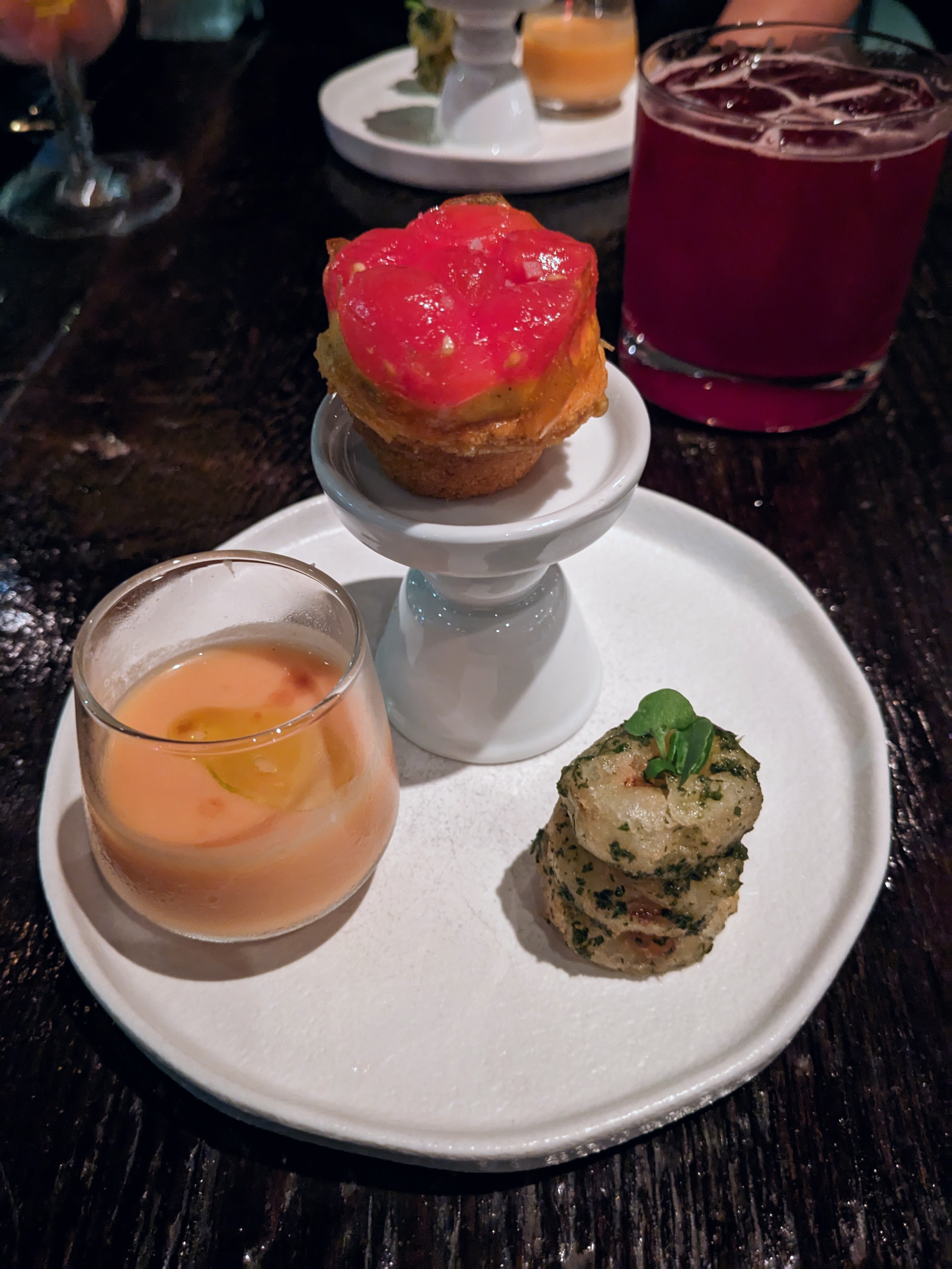 Course 1 | Tomato – The meal started very strong with tomatoes served three ways, and none of them were generic. There was a tomato cake topped with smoked feta and a tomato crown. It was a bold bite and unique enough that it sparked the question “why haven’t I had something like this before?” The fried green tomatoes were delicious and light, but not nearly as memorable. Maybe they could have used a sauce? I’m nit-picking. The gazpacho was amazing. The tomato and olive oil flavors were so vibrant and refreshing. As modest as it is, the little cup provided was likely the best serving size for this soup. Any more and it could have been overwhelming.