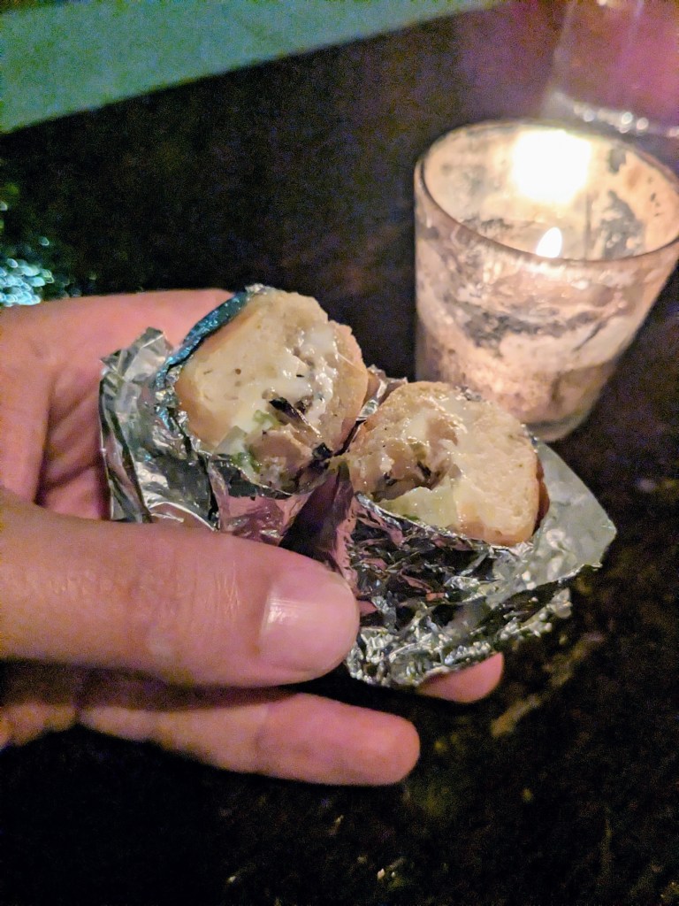 Bonus Course | Chopped Cheese Sandwich – This actually was my favorite dish of the night. My jaw dropped when they started describing it because it was so damn creative. A chopped cheese sandwich is a Harlem bodega icon where they dice up hamburger patties with American cheese and stack it on a hoagie roll with lettuce, tomato, onions, and ketchup. There are variations, but Dirt Candy’s interpretation was inspired. I hope I’m remembering everything, but the filling was grilled kimchi (I think) and cheese. They add that mixture to a tiny roll, wrap it in foil, place it in a tiny paper bag, and serve it with kimchi ketchup in a baby squeeze bottle. It was adorable, but it was also insanely delicious. Maybe they were mushrooms inside, but regardless, this was amazing.