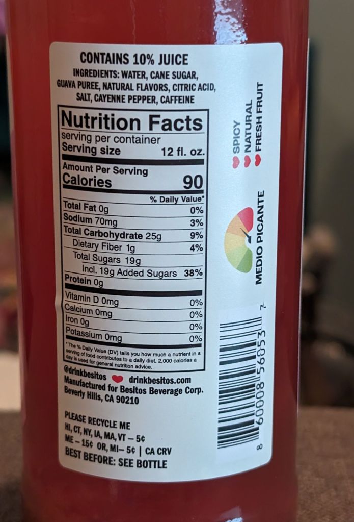 A key characteristic of the Besitos sodas is the “con chile” flavor. You’ll notice cayenne on the ingredients label, and you’ll notice it on your tongue as well. I’d describe the heat level as similar to a spicy ginger beer, but the heat comes from the chiles instead of ginger. This is true for all three sodas. I felt the heat a bit more when I drank the soda while eating spicy Mexican food, so it can contribute to a compounding heat level, but I didn’t think it was overwhelming. Just interesting. Something else that’s common among all three beverages is a conservative amount of sugar. It’s about 19 grams of sugar per 12 ounce bottle, which is less than half of what you’ll find in a traditional can of Coca-Cola. They also contain caffeine (I don’t know how much).