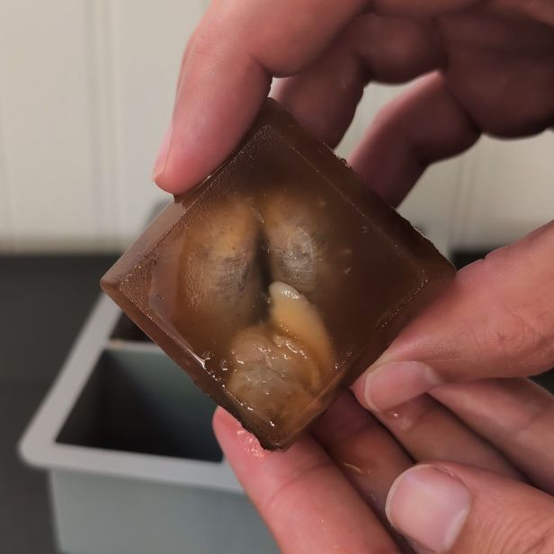 I recommend starting with fresh clams that you’ll steam in a broth made of 1 part water, 1 part Dr Pepper. Once the clams have opened fully (about 7 minutes), remove from the steamer and allow to cool. Reserve your Dr Pepper steaming broth because you’ll use that for ice cubes in the next step. Take your steamed clams, place them in an ice cube mold, and fill with the Dr Pepper broth. The clams should have imparted a bit of clam juice into the broth, so it adds an extra hit of clam as the “clam cube” dissolves in the beverage.