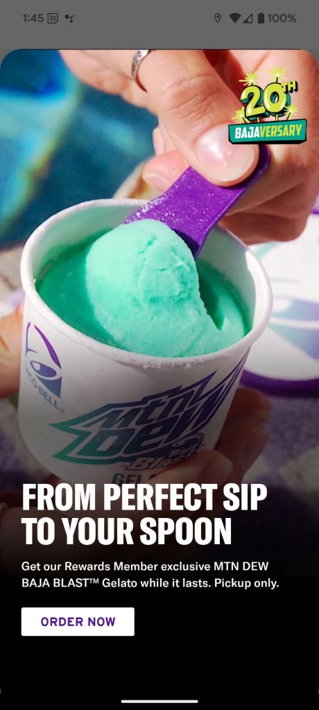 The last problem is that it doesn’t taste quite enough like Mtn Dew Baja Blast. You get a bit of the lime flavor, but it’s more muted than the fountain drink. You don’t get much of the generic citrus notes at all. I really wanted to like it, but I can’t endorse this promotion. Maybe the Mtn Dew Baja Blast Pie will be more successful. For what it’s worth, you need to be a part of the Taco Bell rewards program in order to purchase the gelato (for now). Don’t say I didn’t warn you.