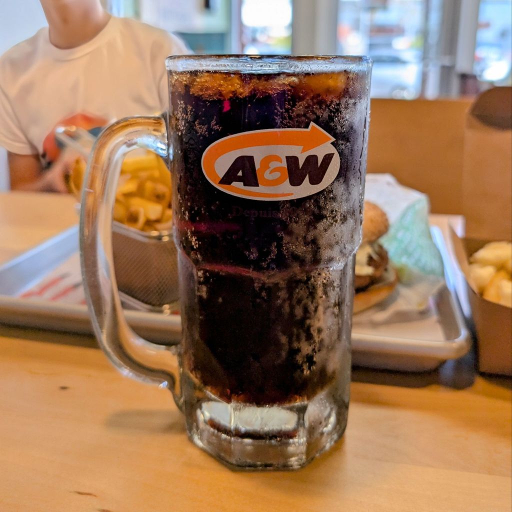 The burger was surprisingly great. I went in somewhat pessimistic because I’ve had bad food at other locations in the past, but I think that’s more a product of laziness of the employees rather than the quality of the concept. The patties were juicy and very well seasoned. All the vegetable toppings were fresh and bright, and the ratio of meat, cheese, topping, and bun was spot on. This reminded me a bit of an In-n-Out double-double. I washed it down with a root beer, and while it wasn’t in a frosty mug, it was still sweet with a caramel/vanilla body. I’m confident that they increase the concentration of syrup for the root beer in the store because the bottled stuff isn’t this good. I discovered later that each A&W restaurant makes the root beer fresh in house. When I dug deeper to find out what that meant, I learned that they mix water, sugar, and root beer concentrate together in a large enough batch to last through the day (or up to a few days).