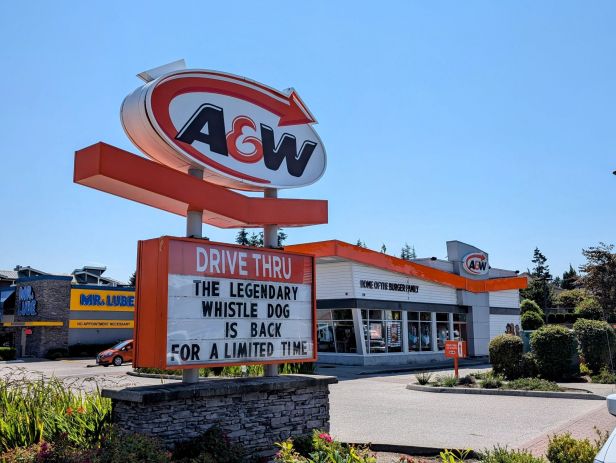 There are a ton of A&W locations in British Columbia. 190, if you believe the internet. There were some so close that I could have comfortably walked between them in less than 10 minutes. The first location I visited was actually inside of a food court (I didn’t do my research well enough), and it had a limited menu, so I drove another 5 minutes and found another. This time it was a proper stand-alone drive-in and had everything we needed.
