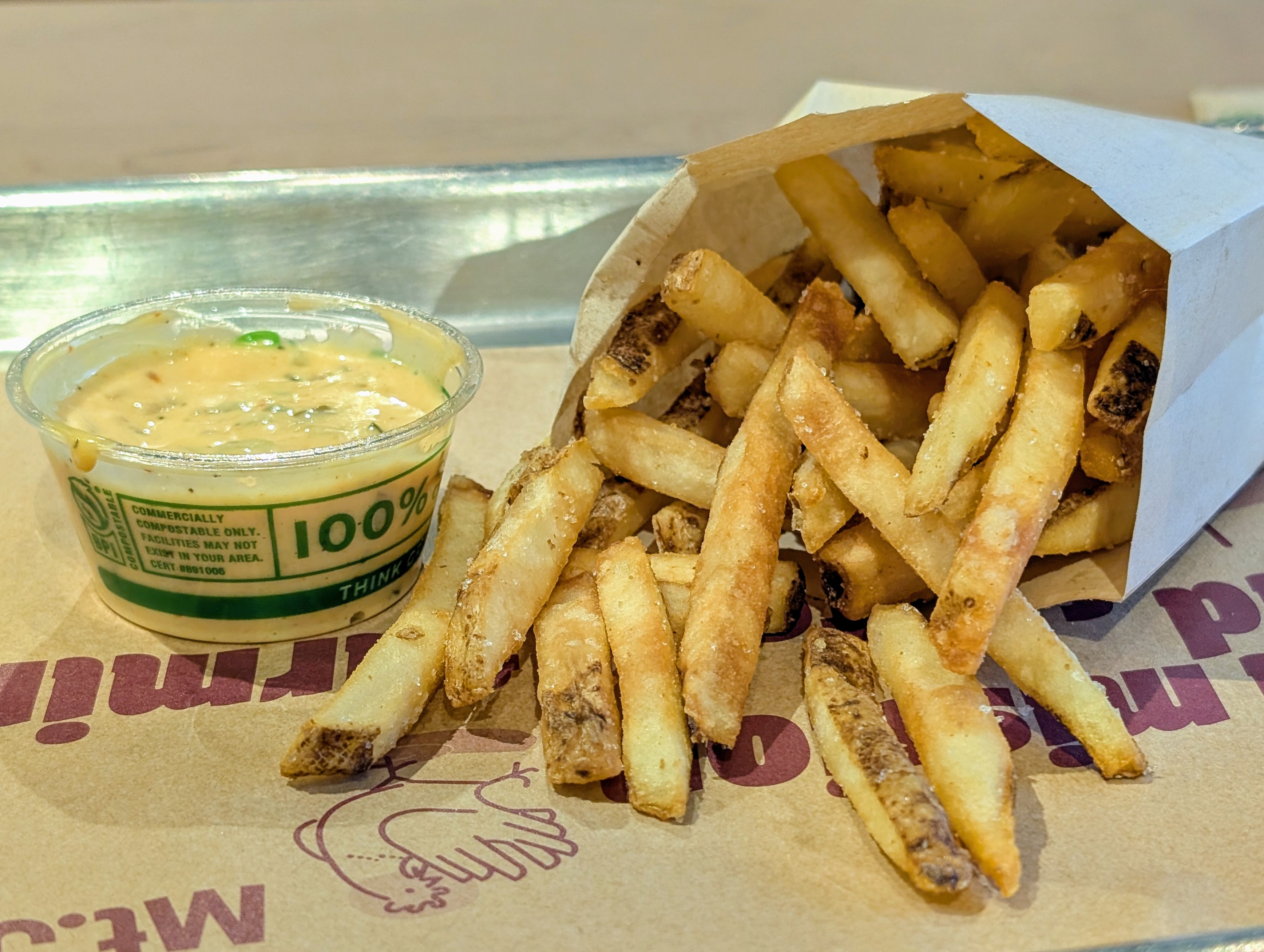 I wasn’t quite at the halfway point, but I had hit a wall. My stomach felt weird, I had a headache, and I would rather drip lemon juice in my eyeballs than eat another french fry. With that attitude, it was time to visit Mt. Joy for Stop 12. This is a sustainable and environmentally friendly (regenerative) fried chicken sandwich restaurant that I had heard was fantastic. I ordered my fries from a kiosk and then told the real human behind the counter that I wanted the smallest portion possible. I explained that I wasn’t very hungry and only wanted a little bit of fries. No problem paying full price. I also ordered a side of their pickle sauce for dipping because I was positive that I’d need some sort of lubrication to get this one down.