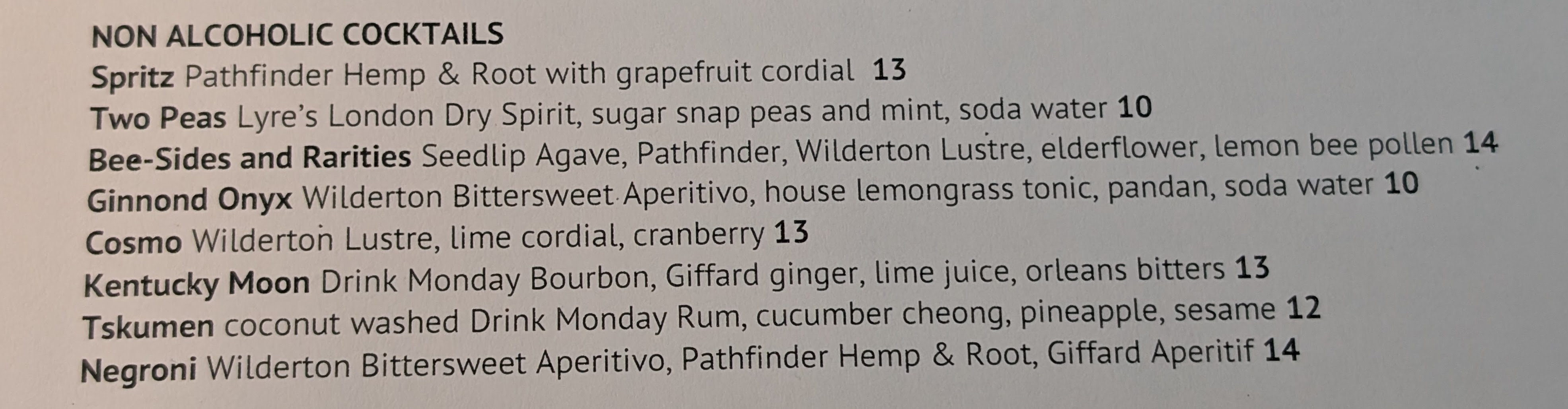 The Kentucky Moon mocktail was delicious and warm. I’ve never had non-alcoholic bourbon. I’ve never had bourbon at all. But the flavors that came through for me were similar to dark honey, light molasses, or brown sugar. That paired exceptionally well with the Giffard’s Ginger non-alcoholic liqueur, and the lime added bright notes to keep everything fresh. The splash of bitters provided another layer of complexity, and it all rounded out to a fantastic drink. This was my second mocktail in a row, and it came at a cost, but it kept my palate alive and gave me something else to think about.