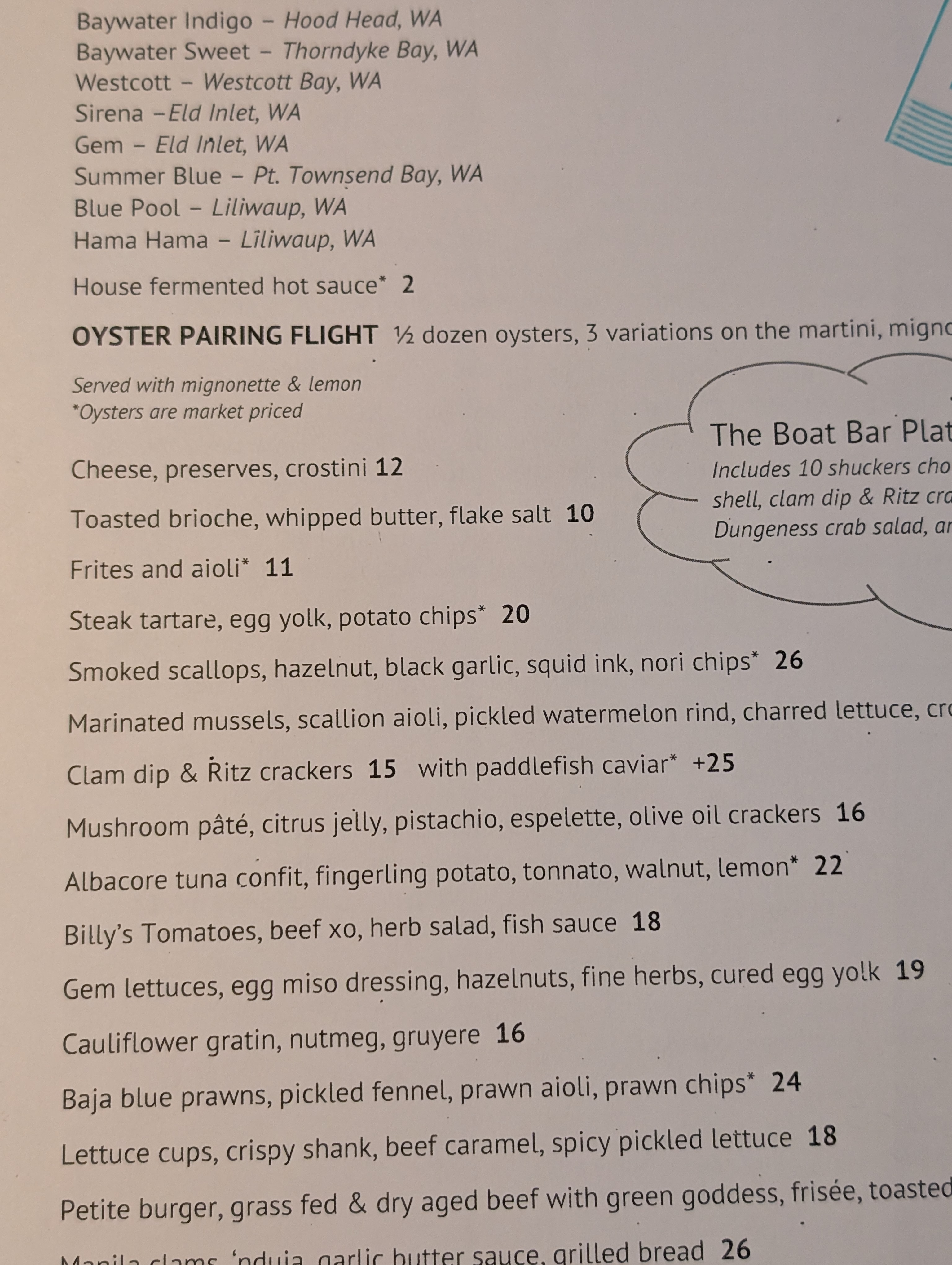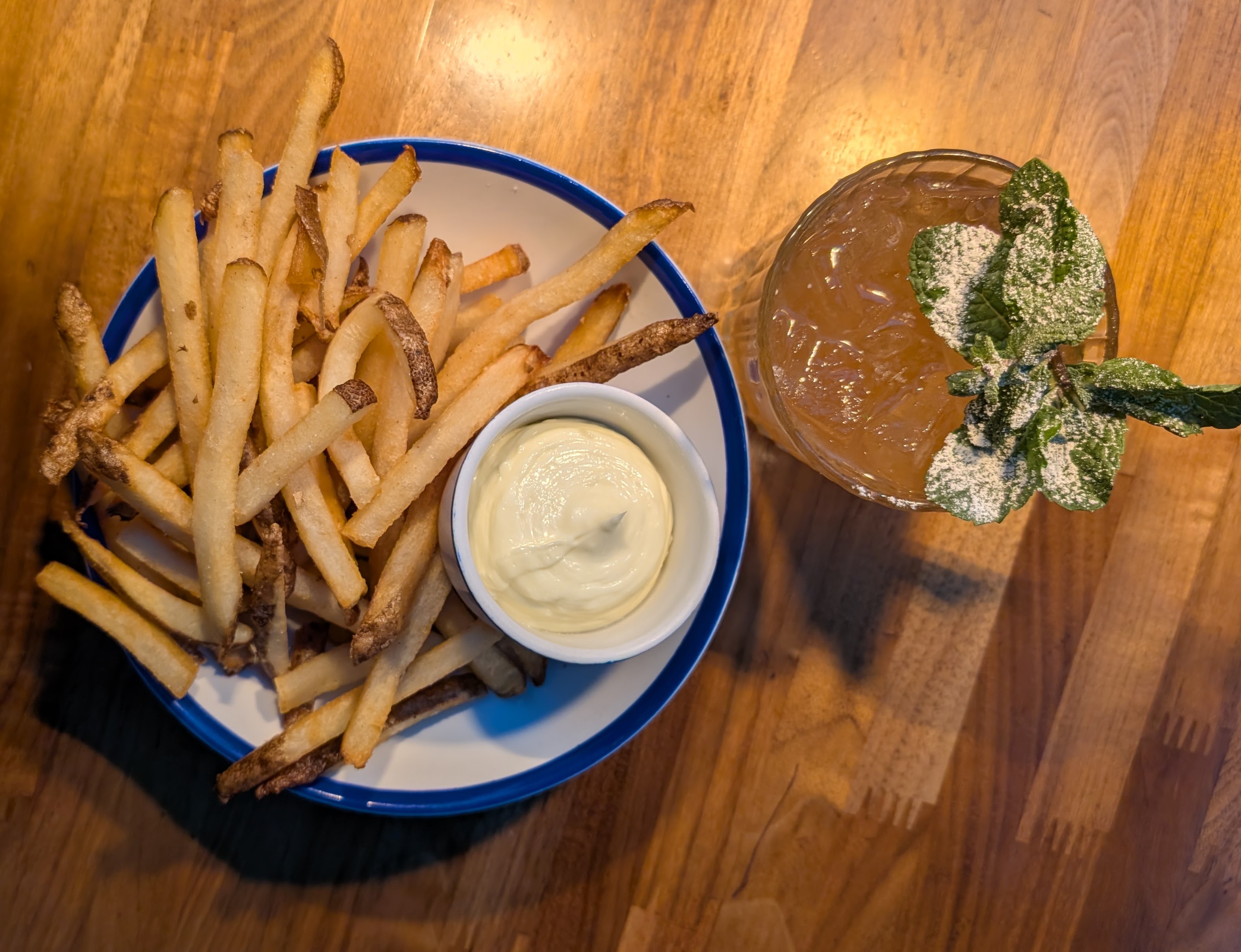 Halfway done and having fun. Not a lot of fun, but at least a little bit of fun. The sun was setting, so I had been eating french fries during every daylight hour. Such a weird day. Stop 13 was the classiest restaurant of the trip and my first visit to Boat Bar (a sister restaurant to Bateau that I had reviewed a few months earlier). The menu focus is predominantly seafood, and while the methodology behind their french fries is similar to Bateau (triple fried, served with aioli), there were some key differences. They fry in vegetable oil instead of beef tallow, and there’s no beef tallow in the aioli. Overall the texture was similar to the fries at Bateau, but the flavor was lighter. I also took advantage of their outstanding non-alcoholic beverage program and ordered a “Kentucky Moon” mocktail with Monday Bourbon (or whiskey?), Giffard Ginger “Liqueur”, lime juice, and Orleans bitters.