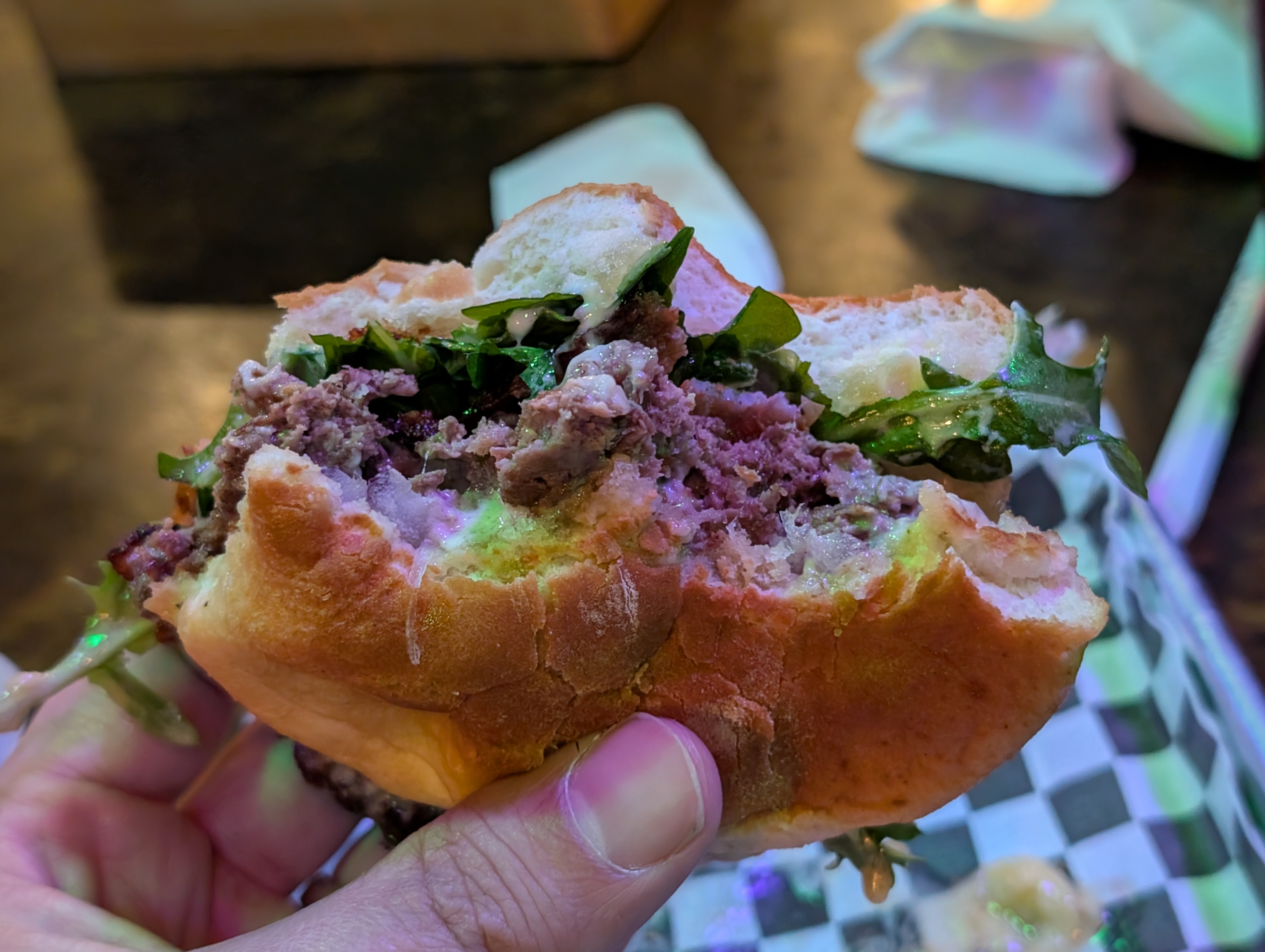 The fries were thick. Very girthy. I measured them at 12mm, and even with multiple frying/blanching it can be difficult to appropriately cook the interiors while getting an crispy exterior. Ox Burger did a reasonable job of preparing them to achieve that result, but even so they were a touch starchy. It’s a lot of potato per bite. Ketchup helps cut through the starch, but I preferred their custom sauces that I ordered extra. I tried both the Jaew Bong Mayo (a fermented pepper sauce) and the Garlic Lime Leaf Aioli. They were both interesting, but the Garlic Lime Leaf Aioli was my favorite. Very vibrant and bright. My wife ordered a special Blue Burger on the menu. I tried a very small bite and thought it was great. 12mm fries might be too thick for me, but Ox Burger did a good job.