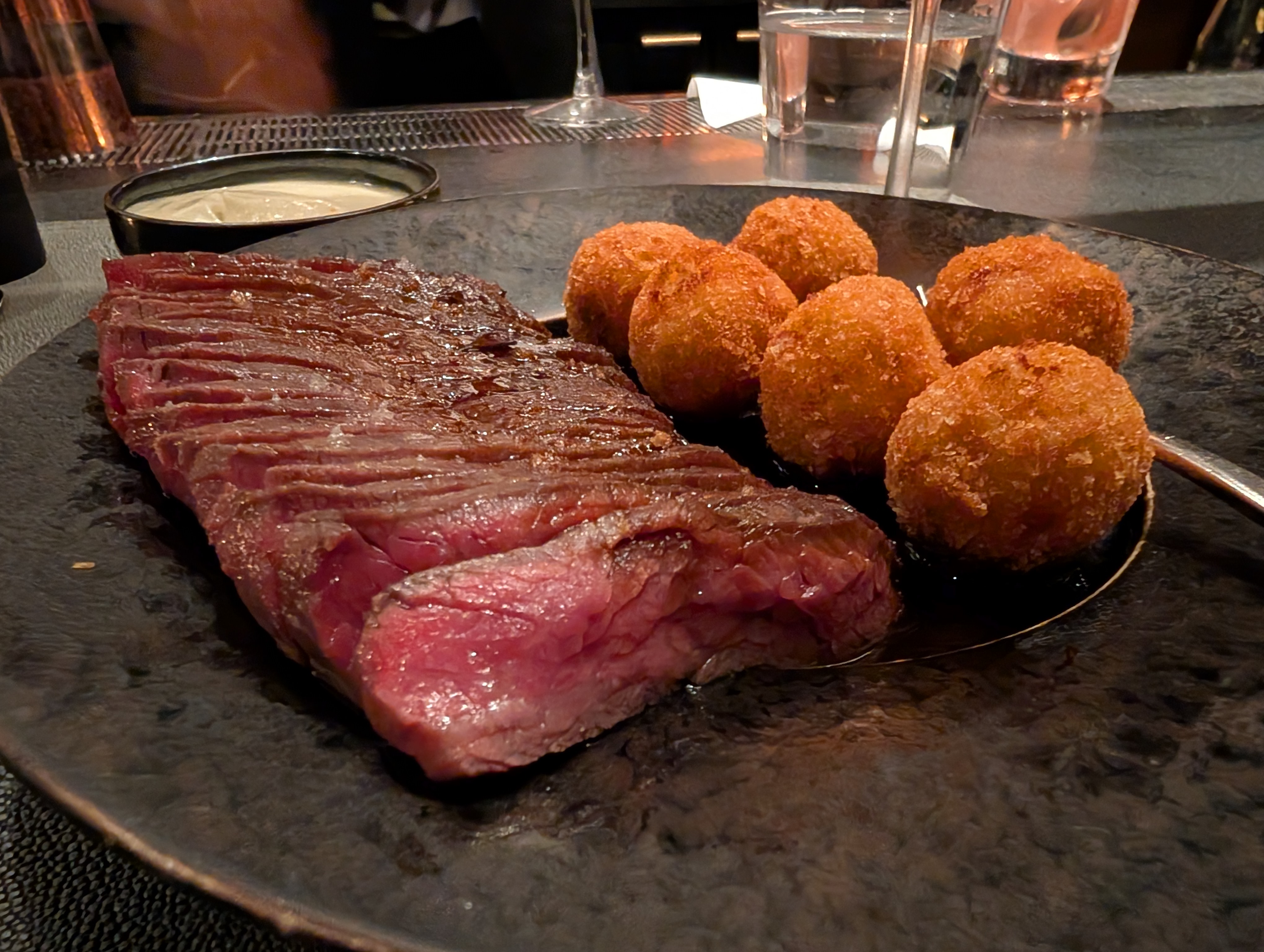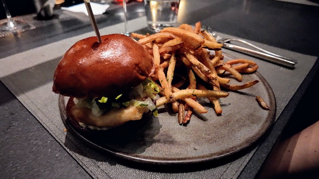 The steak frites exceeded my expectations by a lot. They use a 6 ounce portion of American Wagyu. Not sure of the specific cut, but it looked like it could have been bavette. No one asked me how I wanted it prepared, and that’s because they know how it SHOULD be prepared based on the marbling and tenderness. This was a beautiful steak. It lacks the hard crust that you’d expect to see on a fancy ribeye, but it was buttery soft and incredibly juicy. There’s an optional jus to pour over top and this enhanced the flavor considerably. It also added to the richness of the croquettes. The croquettes tasted like a fried version of the best mashed potatoes I’ve ever had and really benefited from the lemon aioli served alongside. That hint of citrus cuts through the heavy steak and potatoes entree enough to keep your next bite from weighing you down. $55 for this entree was extremely reasonable and might become an automatic-order the next time I visit the lounge for drinks.