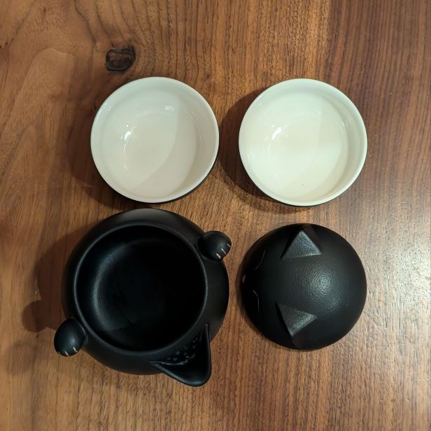 Umi sells all kinds of fancy tea sets, and I wasn’t sure what I’d receive. Their website has a variety of large and elegant sets, but also an extensive selection of smaller more portable sets. The one that they selected for me is a travel tea set with a pot shaped like a happy waving cat with two small tea saucers packed into a form-fitted protective case. It’s adorable, but also very high quality. The kettle and saucers have a slightly orange peel texture and matte finish. The ceramic set also weighs more than I expected. It feels substantial.