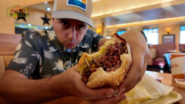 - Astro Burger – Single patty burger with one slice of American cheese and about 1/4 pound of crispy and peppery pastrami. The pastrami was a bit fatty, but had a lot of flavor. I also saw shredded iceberg lettuce, tomato, and probably onion. I thought I tasted a pickle as well, but I didn’t confirm. This was an amazing burger, especially with that crispy pastrami. It was all very juicy and well proportioned.