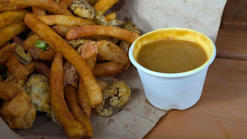 The building blocks are simple. Start with French fries, add fried shredded chicken (somewhere between a nugget and popcorn chicken), toss in onions and peppers, season with a Chinese spice blend, and mix it all together in a brown paper bag. Most places include a side of thick curry sauce for dipping. The exact spice mix and the quality of the curry are what separate one shop from another, but the combination of crisp fries, savory chicken, heat, and a bit of veg sets an impressively high baseline for late-night snacking.