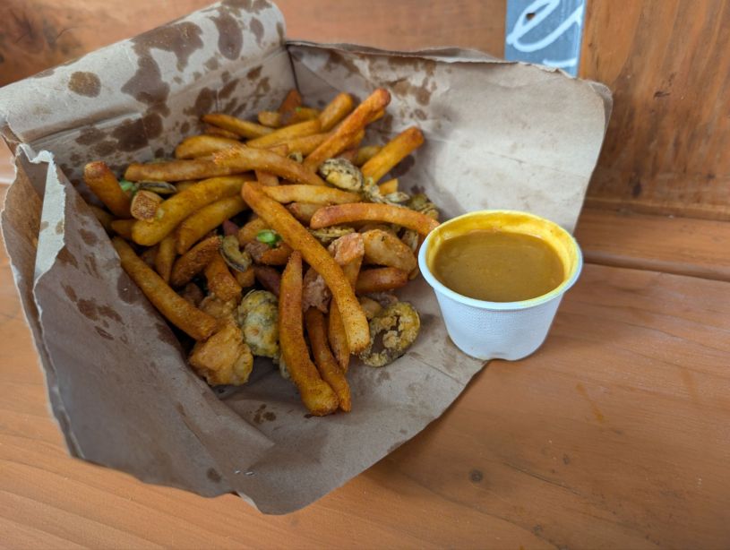 To begin with, the fries are elite. I measured them at about 9mm, but they were perfectly crispy with a well defined crust and a fluffy (almost creamy) center. They kept their crunch the whole meal, despite swimming in a paper bag with the other ingredients. They were coated in a blend of Xi’an and Taiwanese spices that were simultaneously spicy, earthy, and warm. Fried rockfish and shrimp served as the protein, but you can ask for chicken instead. The fish was expertly fried, and the shrimp…were shrimp. I don’t really like shrimp, so I’ll keep my opinion to myself. I counted about 6 pieces of rockfish and 6 shrimp. Instead of peppers and onions, it contained some tempura fried jalapeňo slices. The sauce was served in a cup on the side and was a thick and comforting Japanese style curry. It was a perfect dipping sauce, but I saw others pour it over the top of the fries.