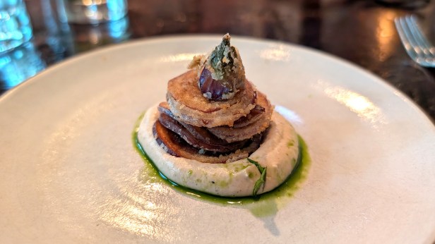 The one meal I truly planned for was dinner at Dirt Candy, the Michelin-starred vegetarian restaurant that’s been proving vegetables can be the main event since 2008. It’s a five-course chef’s tasting menu that changes seasonally, with bonus experimental dishes that sneak in depending on the night. My wife and I had eaten there two years ago and loved it (see my review here) — this time, we wanted to share the experience with our teenagers.