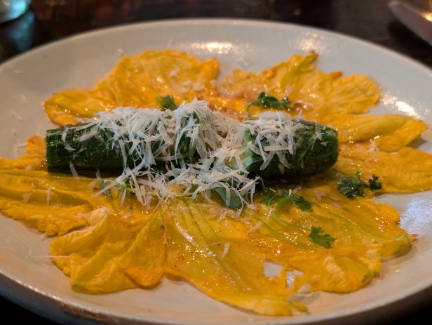 Description: Squash blossom flower, cream cheese, honey, spiralized baby zucchini marinated in Old Bay vinaigrette, grated hazelnuts, horse radish, pecorino cheese, and micro parsley.