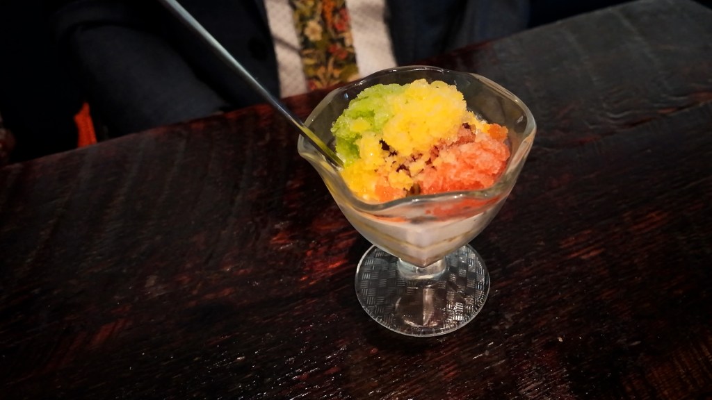 Description: Rainbow bell pepper shaved ice, blueberry mint sorbet, pistachios, apricots, pepperoncini caramel, and whipped ricotta.