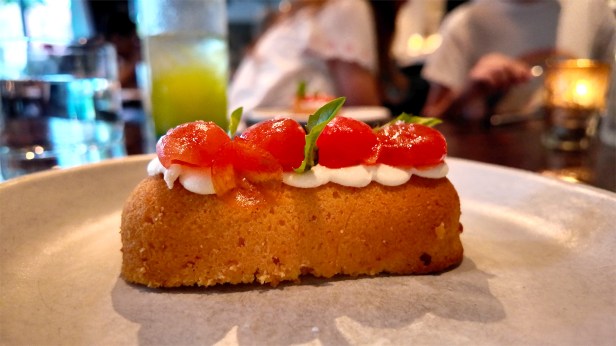 Description: Tomato twinkie filled with yellow tomato jam, topped with a hickory smoked feta smoked with hickory wood chips, marinated cherry tomatoes, tomato leather, and freshly picked basil.