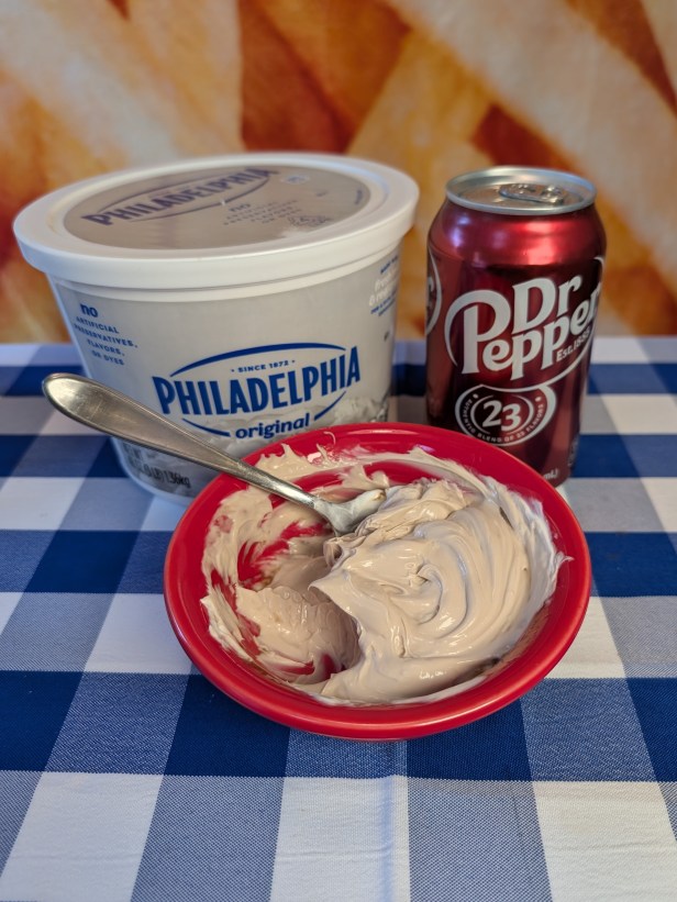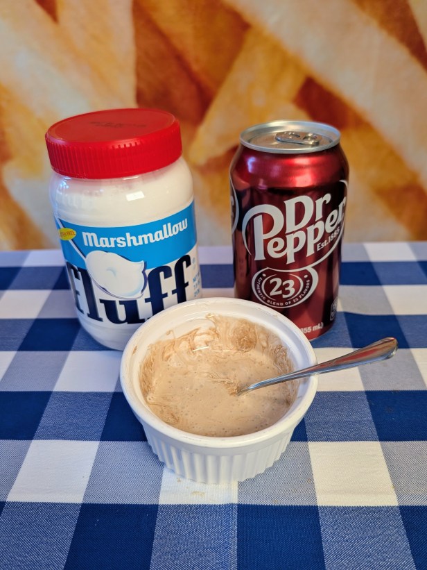 You might remember the Fluffy Dr Pepper recipe that was popular for a bit back in 2025. You add marshmallow fluff to the inside of a glass and then pour in your Dr Pepper. It gives a somewhat marshmallowy flavor to your drink, but it also kills the carbonation. I took inspiration from that and added Dr Pepper syrup to marshmallow fluff and drizzled that on top of the dog as well.