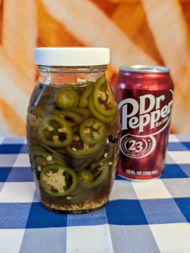 After that I layered on the Dr Pepper caramelized onions. The recipe for those was as simple as pouring in some Dr Pepper while cooking down the onions. The jalapeños took a bit more effort, though. I boiled 1 cup of white vinegar, 1 cup of Dr Pepper, and about a tablespoon of salt. I sliced a few jalapeños very thin, layered them in a glass jar, sprinkled in a few peppercorns, and then poured as much of the hot vinegar solution as I could. After letting it sit on the counter for about 30 minutes I put it in the fridge to cool down.
