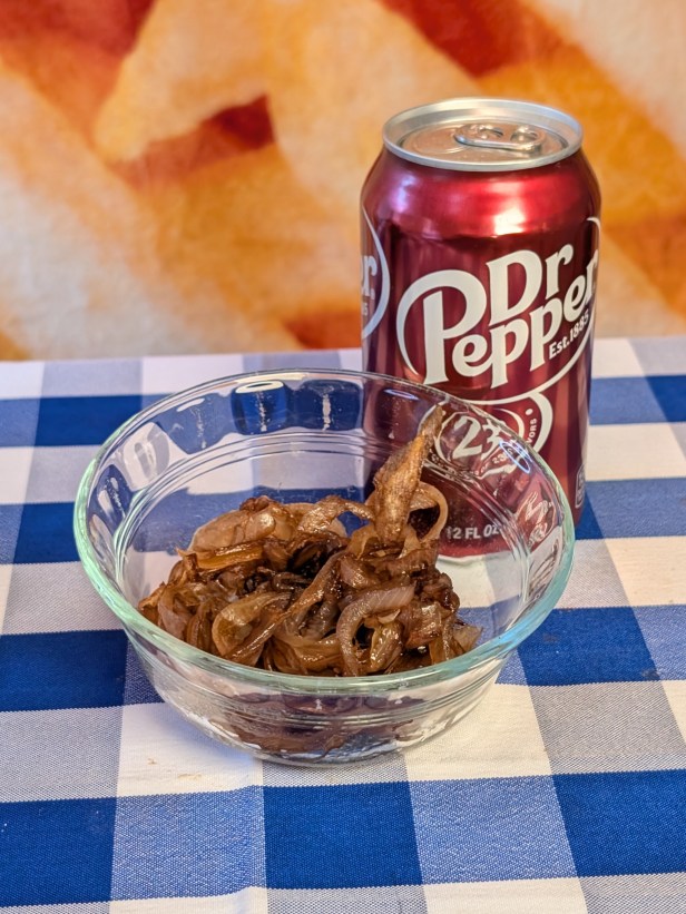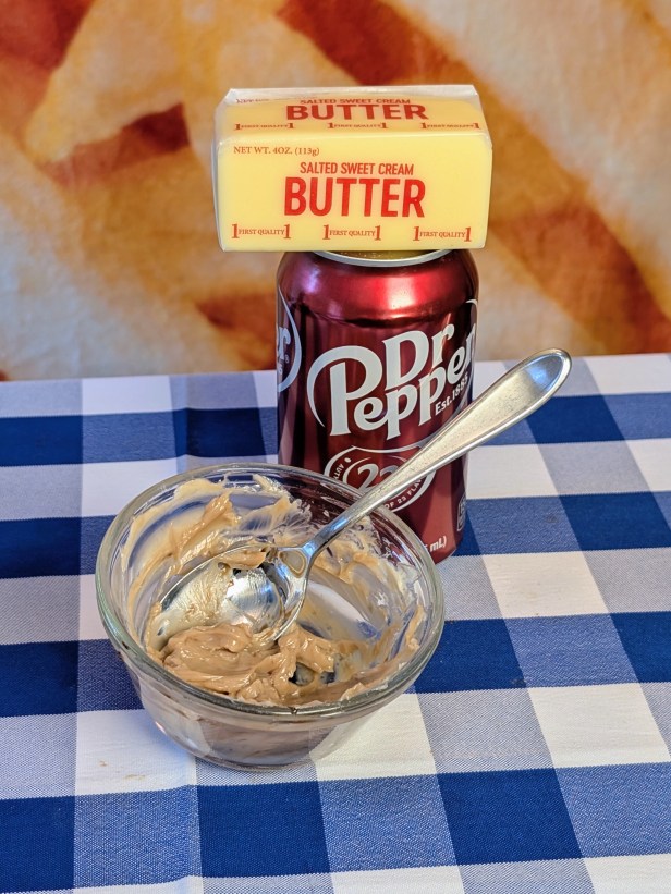 I don’t think I need to justify those first two components, but let me explain the rest. To make my compound butter I reduced a 12 ounce can of Dr Pepper down to one ounce of concentrate. I poured about a teaspoon of that syrup into some softened butter, then I spread that on the roll for my sausage. Just assume that every other component will be at least a little sweet and taste at least a little like Dr Pepper.